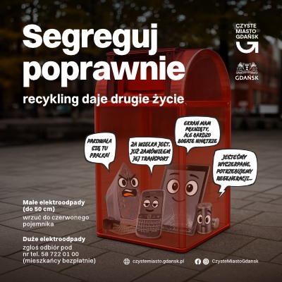 Telefony, tablety, ładowarki, suszarki, żelazka i inne drobne urządzenia można wrzucać do czerwonych pojemników na elektroodpady, które znajdują się w różnych punktach miasta. Można je również oddać do Gdańskich Sorterowni (PSZOK-ów) lub przekazać podczas Objazdowej Zbiórki Odpadów Niebezpiecznych.