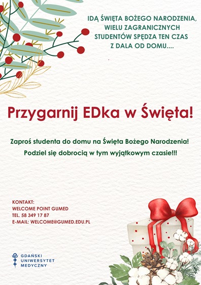 Szanowni Państwo, Chcielibyśmy zaprosić Państwa do kolejnej edycji Akcji Świątecznej – Przygarnij EDka w Święta Wielu zagranicznych Studentów Gdański Uniwersytet...